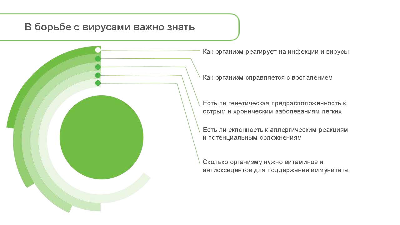 Индивидуальный генетический анализ иммунитета позволяет узнать, насколько ваш организм способен переносить тяжелые состояния и сопротивляться инфекциям, в том числе вирусным.